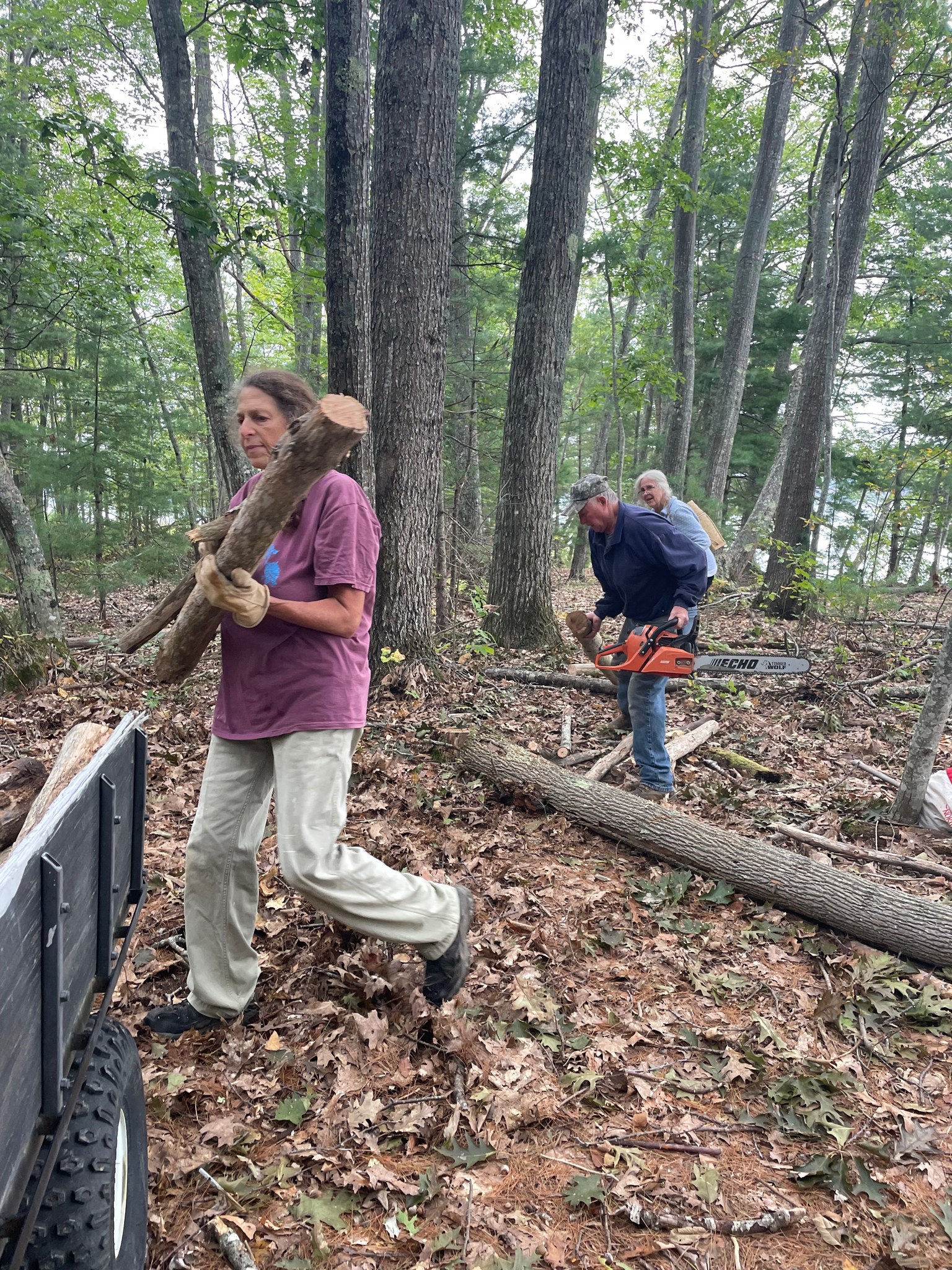 On Sept. 24, 2023, 13 volunteers gathered to make the 11th campsite of the PRPT, located on Bowden Point in Prospect. We worked from 9 am to 1 pm to clear and mow two small fields, clear the ground of logs and brush for tents, carry in a picnic table, an outhouse, and a three-part stairway to install from the beach up the bluff. Rick Henion, vice president of the PRPT, built the outhouse and the stairs at home and brought them on a trailer.
